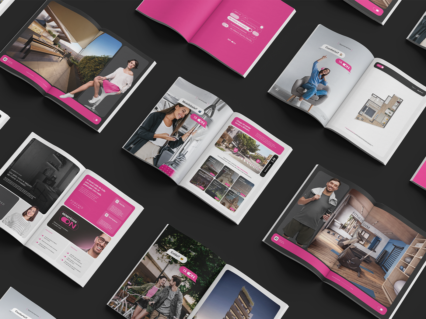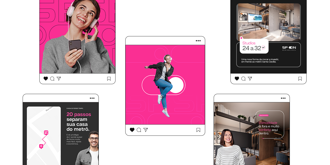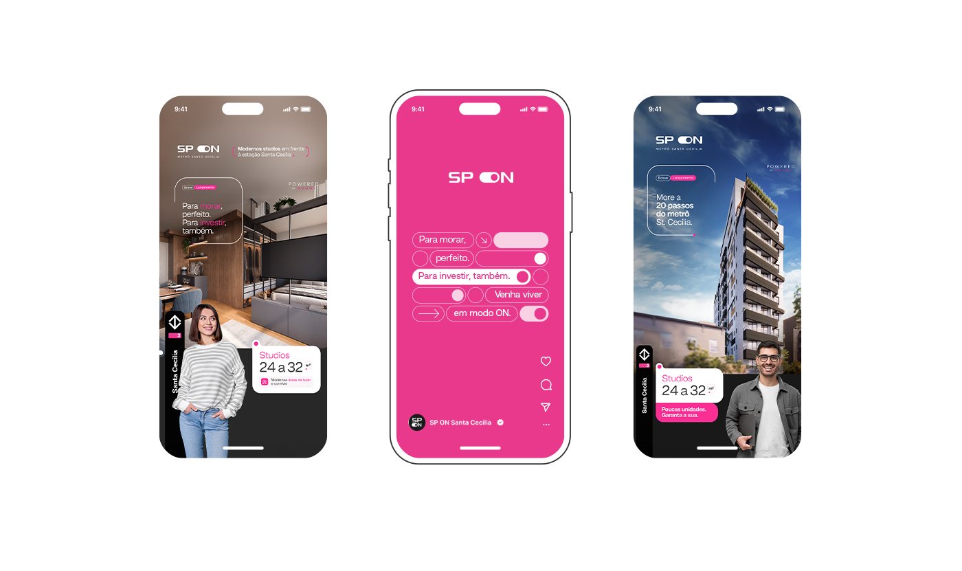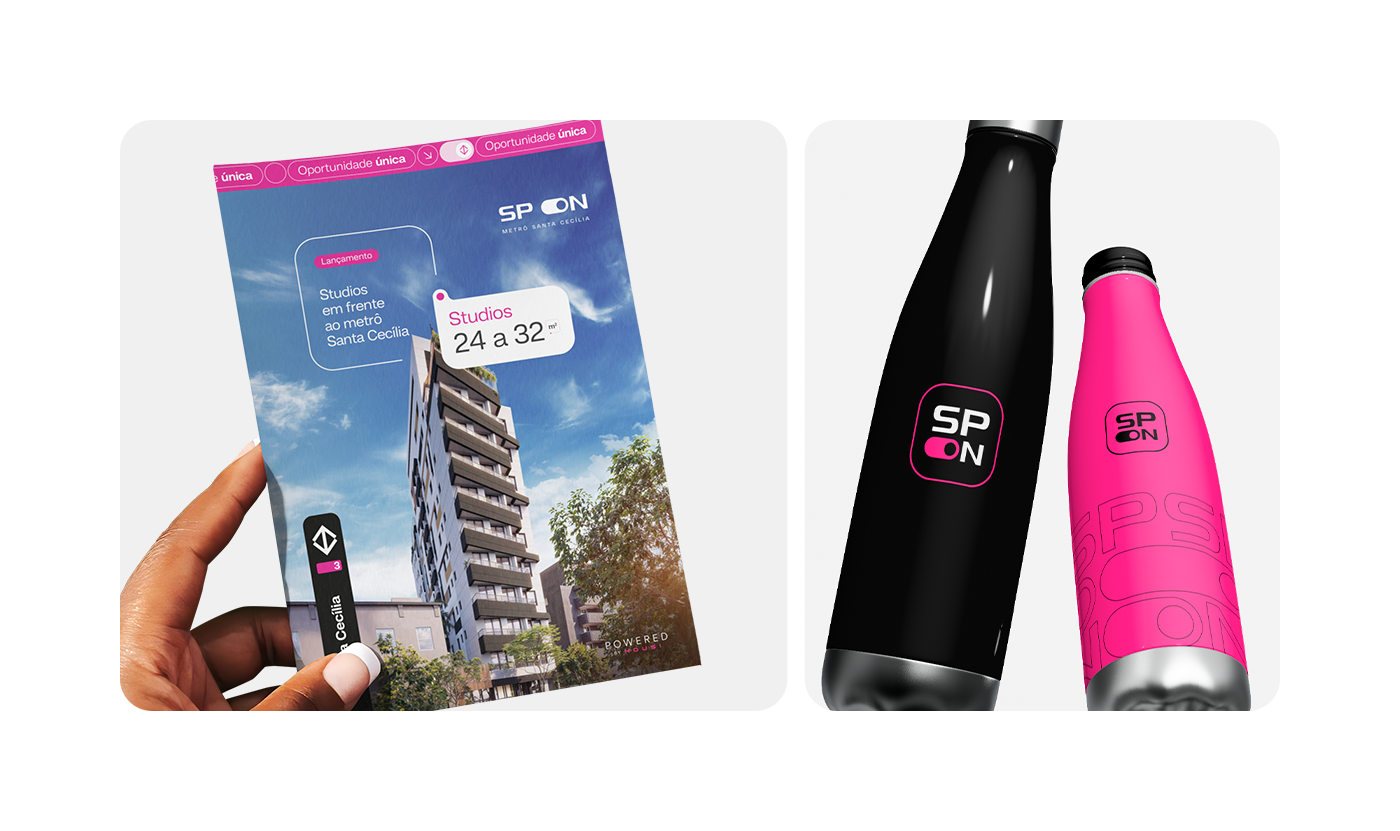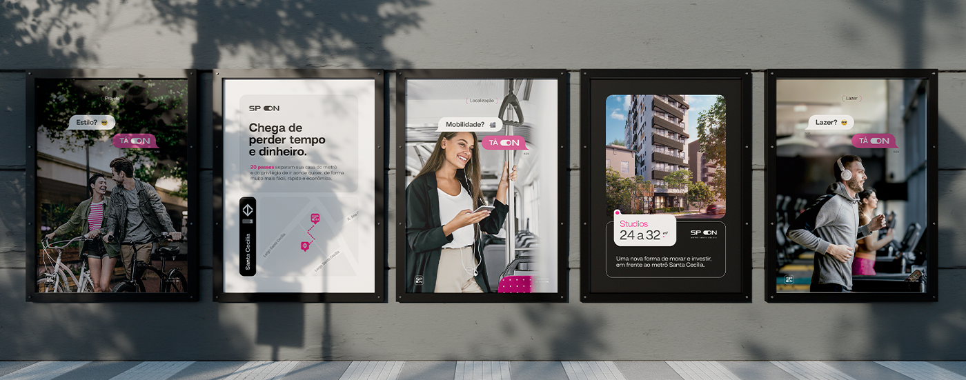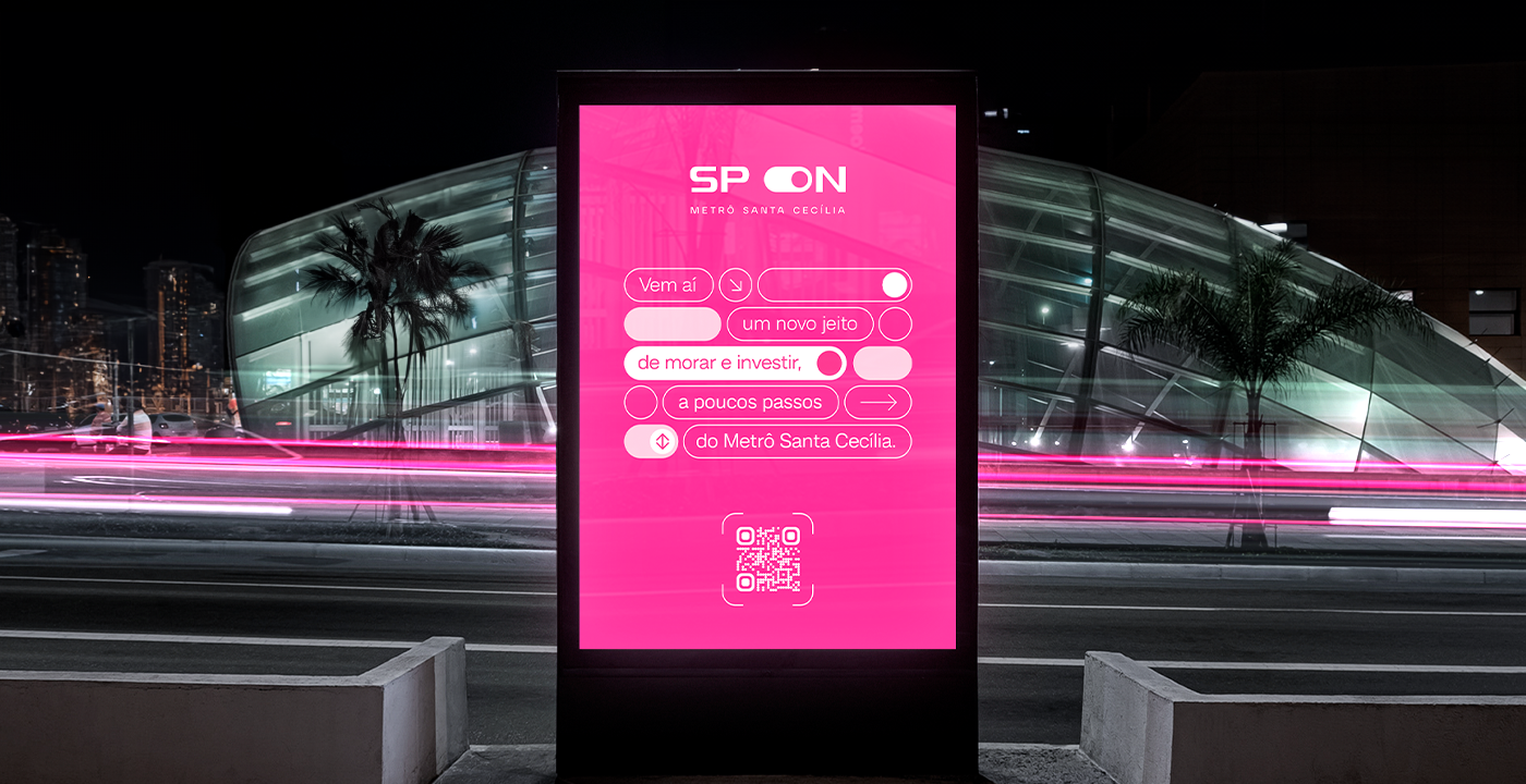 SP ON is a real estate product by Lógica Engenharia. In this project, the art direction was crafted to visually capture the practicality, convenience, and modernity of living in São Paulo, reflecting this essence in a simple, sophisticated manner that is perfectly aligned with the city's rhythm.